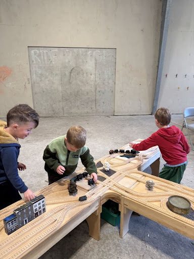 When they weren’t building ramps, they were busy being architects! A huge favorite of the day was the collection of large magnetic tiles, which the children transformed into giant forts. They also utilized big foam shapes to build their own structures, with many students working together to build a life-sized train. Speaking of trains, FLIP also brought a huge train setup that completely captivated our little engineers.